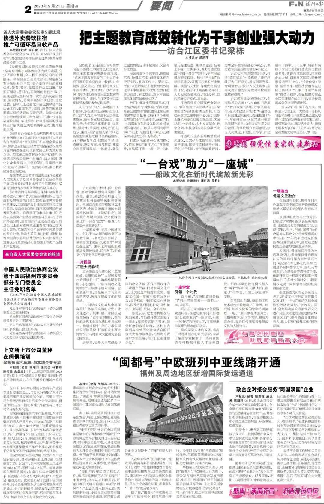 金秋时节,行走台江,学习贯彻习近平新时代中国特色社会主义思想主题教育的热潮扑面而来。“这次主题教育是党的二十大后全党开展的首次党内集中教育,时点特殊、意义重大。台江区将坚决扛牢政治责任、主体责任,以严实作风、务实举措,确保交出主题教育的优异答卷。”昨日,台江区委书记梁栋接受本报记者专访时表示。 习近平总书记在福建福州工作期间,多次到台江区调研指导工作,为广大党员干部留下宝贵的思想财富、精神财富和实践成果。梁栋表示,台江区将牢牢把握“学思想、强党性、重实践、建新功”的总要求,用好用活“苍霞人家”等4处新思想实践基地和12条特色路线、64个特色教学点,把理论学习、调查研究、推动发展、检视整改、建章立制等贯通起来、一体推进,确保主题教育规定动作做到位,又富有台江特色。