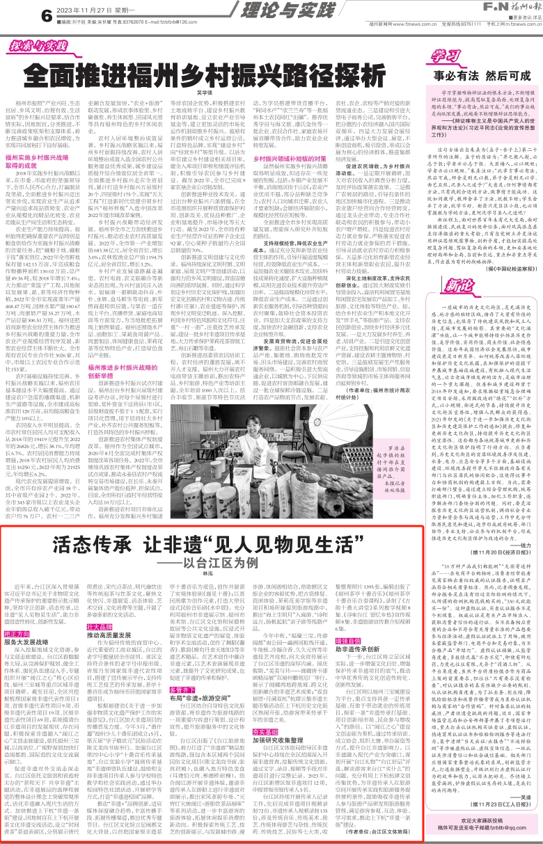 活态传承 让非遗“见人见物见生活” ——以台江区为例 近年来,台江区深入贯彻落实习近平总书记关于非物质文化遗产传承保护的重要指示批示精神,坚持守正创新、活态传承,让非遗“见人见物见生活”,助力非遗创造性转化、创新性发展。 深入挖掘地域文化资源,参与文创走廊建设。台江区着眼服务大局,从完善保护规划、健全工作体系、强化队伍建设入手,专题组织开展“闽江之心”核心区沿线、福州三宝城等重点区域非遗项目调研。截至目前,全区共挖掘梳理国家级非遗代表性项目1项、省级非遗代表性项目9项、市级非遗代表性项目19项、区级非遗代表性项目69项,系统摸清台江非遗项目的发展现状、存在问题,积极探索非遗融入“闽江之心”文创走廊建设,依托福州三宝城,以高站位、广视野谋划加快打造闽都韵、国际范的文化交流展示窗口。 “闽江之心”核心区 福州三宝城 福州日报/图 促进非遗对外交流走深走实。台江区依托文旅部和省政府主办的“茶和天下 共享非遗”主题活动,在非遗展品的选择和展览的整体设计理念上突破常规形式,活化非遗融入现代生活的方式。加快推进上下杭“非遗一条街”建设,因地制宜在上下杭开展茶文化非遗交流活动,设立“时间煮茶”茶道表演区,分别展示唐代煎煮法、宋代点茶法、明代瀹饮法等传统泡茶与饮茶文化,聚焦文化快闪、非遗展览、活态体验、艺术空间、文化消费等主题,开展了多姿多彩的文化活动。 作为福州传统的商贸中心、近代重要的工商业城区,台江的老字号数量居全市前列。该区支持符合条件的老字号申报市级、省级乃至国家级非遗代表性项目,搭建了宣传展示平台,支持传统工艺技艺的传承发展,茶亭十番音乐成为福州市首批国家级非遗项目。 茶亭十番音乐 台江史志/图 根据福建省《关于进一步加强非物质文化遗产保护工作的实施意见》,台江区加大非遗项目的传播普及力度。今年3月,“番什遛”福州少儿十番乐团成立;5月,第五届“学子敬状元”民俗活动在陈文龙尚书庙举行。加强台江区第四中心小学“十番音乐传承基地”、台江实验小学“闽剧传承基地”非遗师资队伍建设,鼓励和支持非遗项目传承人参与学校特色教学和社会实践活动,通过举办校园特色社团活动、开展研学等方式,打造“非遗进校园”品牌。 台江第四中心小学茶亭十番音乐传承基地表演茶亭十番《奏起十番迎嘉宾》 福州市台江区文化馆/图 推动“非遗+”品牌创新,适应媒体深度融合趋势,丰富传播手段、拓展传播渠道,推出优秀专题节目。台江区文化馆立足闽都文化大背景,以首批国家级非遗茶亭十番音乐为底色,创作并展演了实境体验剧《遇见十番》;以疍民渔歌为创作元素,打造大型沉浸式民俗音乐剧《水中厝》。充分利用福州市非遗展示馆、福州市美术馆、台江区文化馆和侯德榜故居等公共文化设施,沉浸式开展非物质文化遗产的展览、体验和学术交流活动,创作了舞蹈《馨香》、歌曲《唯有丹衷天地知》等非遗艺术精品。在艺术创作中融合非遗元素,以艺术表演展现非遗元素,既提升了文化研究成果,也促进了非遗的传承和保护。 台江区结合自身特色文化旅游资源,将非遗作为旅游线路的一项重要内容进行策划、设计和宣传,提升旅游服务中的文化体验。 《台江旅游地图》 台江区出版了《台江旅游地图》,着力打造了“非遗游”精品旅游线路,既包含本区域两个民间民俗文化项目(陈文龙尚书庙、张真君殿),也融入地方特色美食(耳聋伯元宵、彬德桥 时米粿)。结合闽江游开展非遗体验,邀请非遗传承人在游船上进行非遗面对面展示,推出宋风茶韵专场、“元宵灯火映闽江·游船饮茶品福味”等系列活动,进一步丰富游客的旅游体验,拓展休闲娱乐消费的新动向。积极探索传统工艺、技艺的创新展示,与发展城市游、漫步游、休闲游相结合,借助辖区文旅企业的客源优势,把古瓷修复、瓷画体验、茉莉花美学馆等非遗项目和场所嫁接到旅游线路中,推出“海上生明月”入闽游、“诗和远方,扬帆起航”亲子游等线路产品。 “福聚三宝,舟游闽都”南公园—瀛洲河航线 “美美与共——闽藏唐卡漆画精品展” “双喜福厝·月满双杭”杭肆云集 今年中秋,“福聚三宝,舟游闽都”南公园—瀛洲河航线开通,牛角梳、冷凝合香、久久元宵等非遗技艺齐亮相,向大众宣传展示了台江区非遗的深厚内涵。国庆假期,“美美与共——闽藏唐卡漆画精品展”在福州雕刻总厂举行,展示了闽藏两地跨地域、跨文化创新融合的非遗艺术成果;“双喜福厝·月满双杭”杭肆云集非遗主题市集活动在上下杭历史文化街区热闹开张,给游客带来传承千年的非遗之美。 台江区文体旅局指导区非遗保护中心持续在全区范围深入开展非遗普查,挖掘传统文化资源,通过文字、录音、视频等手段对非遗项目进行完整记录。2023年,台江区新增区级非遗项目12项,申报晋级市级传承人5名。 《古韵十番大讲堂》系列教学视频(节选) 台江区持续开展传承人记录工作,先后完成非遗项目视频录制72份、非遗传承人视频录制135份,涉及传统音乐、传统美术、曲艺、传统体育游艺与杂技、传统医药、传统技艺、民俗等七大类,收集整理照片1395张,编辑出版了《福州茶亭十番音乐》《福州茶亭十番音乐合奏课程》,录制了《古韵十番大讲堂》系列教学