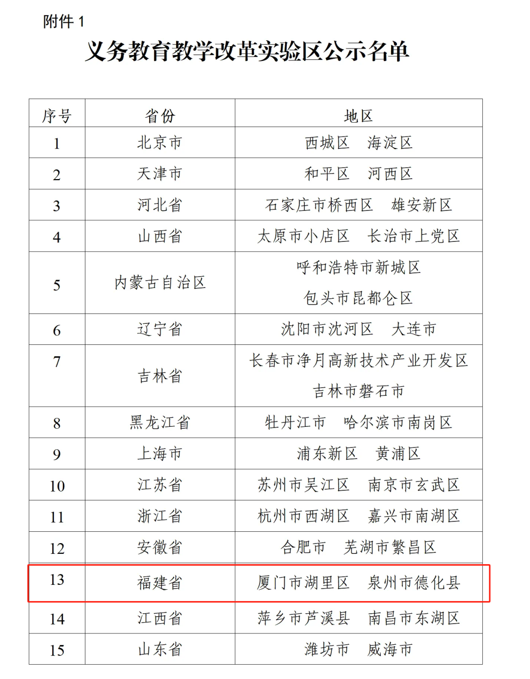 其中,厦门市湖里区、泉州市德化县入选义务教育教学改革实验区。福建省内,莆田市城厢区南门学校、长汀县新桥中学、福州市鼓楼第二中心小学、晋江市金井毓英中心小学、南平市建阳区实验小学、福安师范学校附属小学入选义务教育教学改革实验校。 1月7日,记者从福州市鼓楼第二中心小学相关工作人员处了解到,该校确实入选了义务教育教学改革实验校。 通知和公示信息发布后,微信群、微信朋友圈及其他网络平台出现“教育部最新公立教育改革试点方案,实验区将实行缩短学制、取消中考”等不实信息。前几年也曾有类似谣言在网上传播,教育部和有关地方教育部门已第一时间进行辟谣。 对此,教育部新闻办提醒广大网友,《教育部办公厅关于推荐义务教育教学改革实验区和实验校的通知》明确了义务教育教学改革实验区和实验校的工作任务,其中并无缩短学制、取消中考等内容,不要轻易采信非官方渠道的信息。义务教育教学改革实验区名单