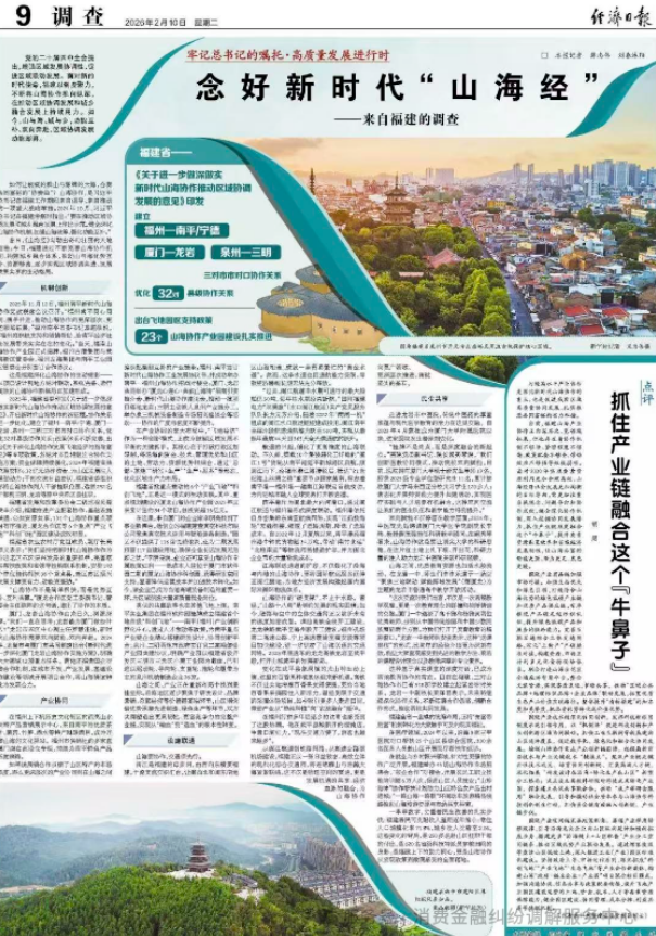 如何让蜿蜒的群山与澎湃的大海,合奏共同富裕的“协奏曲”?2月10日,《经济日报》刊发《念好新时代“山海经”——来自福建的调查》,整版聚焦福建。全文如下——党的二十届四中全会提出,增强区域发展协调性,促进区域联动发展。面对新的时代使命,福建以制度聚力,不断将山海协作推向纵深,在推动区域协调发展和城乡融合发展上持续用力。如今,山与海、城与乡,功能互补、双向奔赴,区域协调发展动能澎湃。如何让蜿蜒的群山与澎湃的大海,合奏共同富裕的“协奏曲”?山海协作,是习近平总书记在福建工作期间亲自倡导、亲自推动的一项重大战略举措。2024年10月,习近平总书记在福建考察时指出:“要在推动区域协调发展和城乡融合发展上作出示范。健全深化山海协作机制,加强山海统筹、强化功能互补。”昔日,《山海经》勾勒出奇幻壮丽的天地画卷;今日,福建通过不断完善山海协作机制、构建城乡融合体系,推动山与海优势互补、资源畅流,逐步实现区域协调共进、发展成果共享的生动格局。2025年11月12日,福州南平新时代山海协作党政联席会议召开。“福州南平同心同向、携手并进,推动山海协作向更深层次、更宽领域拓展。”福州南平市委书记袁超洪说,“福州的积极支持和倾情帮助,给南平经济社会发展带来实实在在的变化。”当天,福南山海协作产业园正式揭牌,福州古厝集团与武夷新区管委会、福州左海集团与南平工业园区管委会分别签订合作协议。这是福建深化山海协作的生动缩影——从顶层设计到地方结对联动,系统完备、运行高效的山海协作新格局正加速形成。2023年,福建省委印发《关于进一步做深做实新时代山海协作推动区域协调发展的意见》,开启新时代山海协作的新征程。协作关系进一步优化,建立了福州—南平/宁德、厦门—龙岩、泉州—三明三对市市对口协作关系,优化32对县级协作关系;政策体系不断完善,出台《关于深化山海协作发展飞地经济的指导意见》等专项政策,各结对市县相继出台协作实施方案;资金保障持续强化,2024年福建省共统筹安排6.32亿元协作资金,为山区发展注入强劲动力;干部交流日益密切,福建省委组织部将山海协作列入干部挂职范围,选派252名干部到三明、龙岩等原中央苏区县挂职。福建省发展和改革委员会二级巡视员聂秉丰介绍,福建推进产业配套协作、基础设施联通、公共资源共享,101个山海协作重点项目有序推进,厦龙合作区等6个重点“产业飞地”“科创飞地”园区建设成效初显。福建省农业农村厅党组成员、副厅长吴顺意表示:“我们坚持把新时代山海协作作为推进老区苏区振兴发展的重要抓手,完善落实帮扶政策和省领导挂钩联系机制,安排192个单位挂钩帮扶38个重点县,老区苏区振兴发展支撑更有力、动能更强劲。”“山海协作不是简单帮扶,而是优势互补、互利共赢。”厦龙合作区党工委副书记、管委会主任陈阵的这句话,道出了协作的本质。厦门、龙岩山海协作由来已久,渊源深厚。“我们一直在思考:龙岩能为厦门做些什么?”龙岩市苏区中心副主任罗慧连说,新时代山海协作需要双向赋能、双向奔赴。2024年,龙岩市与厦门市共同制定出台《新时代进一步深化厦门龙岩山海协作实施方案》,明确六大领域12项重点任务。两地还探索国企对接合作机制,在城市开发、产业发展、基础设施建设等领域开展项目合作,将山海情谊转化为发展合力。在福州上下杭历史文化街区的武夷山水农特产品营销展示中心,来自南平的优质茶叶、菌菇、竹笋、酒水等特产琳琅满目,成为连接山海的文化驿站。福州市供销社的多家直属门店在此设立专柜,持续为南平特色产品拓宽销路。如果说展销合作点燃了山区特产的市场热度,那么更深层次的产业协同则在山海之间编织起坚韧互补的产业链条。福州、南平签订新时代山海协作工业发展协议书,并成功举办南平—福州山海协作招商对接会;厦门、龙岩共同举办“厦龙心连心·共叙山海情”招商引资推介会、新时代山海协作座谈会,推动一批项目落地龙岩;三明主动嵌入泉州产业链分工,举办泉三机械装备制造专场招商座谈会等活动……协作的广度与密度不断提升。在产业协同的宏大布局中,“飞地经济”作为一种创新模式,正成为破解区域发展不平衡的关键抓手。其核心在于打破行政区划限制,将沿海的资金、技术、管理优势和山区的土地、劳动力、资源优势相结合,通过“总部+基地”“研发+生产”“生产+服务”等形态,优化区域生产力布局。福建首批重点推动的6个“产业飞地”“科创飞地”,正是这一模式的生动实践。其中,重点规划建设的厦龙山海协作产业园2025年以来累计签约34个项目,总投资超16亿元。在这里,来自厦门的企业家李明亮找到了事业新舞台。他创立的福建建壹真空科技有限公司聚焦真空技术应用与智能装备制造。“园区不仅提供了116亩优质地块,还为二期发展预留117亩建设用地,确保企业长远发展无后顾之忧。”李明亮说,企业还可享受山海协作专属政策红利——低成本入驻位于厦门市软件园二期的厦龙山海协作科创园,获得研发空间支持,显著降低运营成本并加速技术转化。如今,该企业已成为当地高端装备制造的重要一环,为区域创造大量高质量就业岗位。